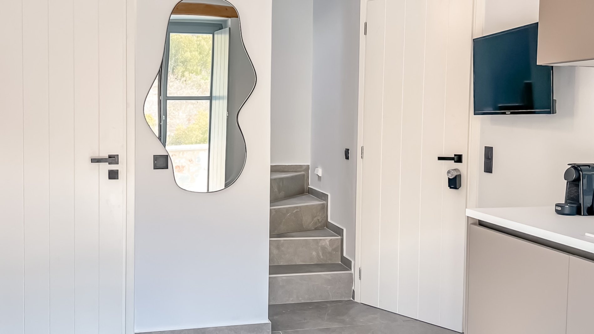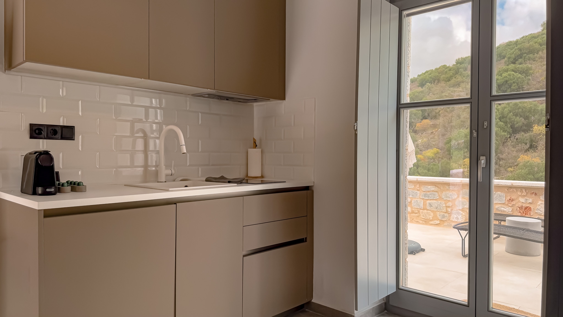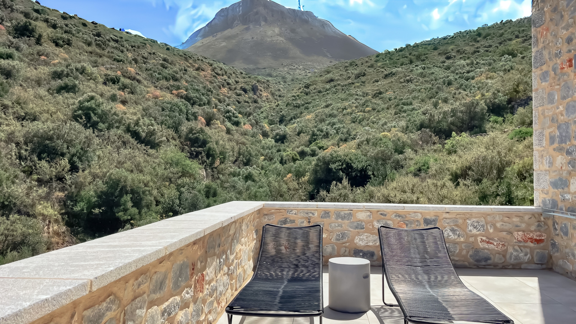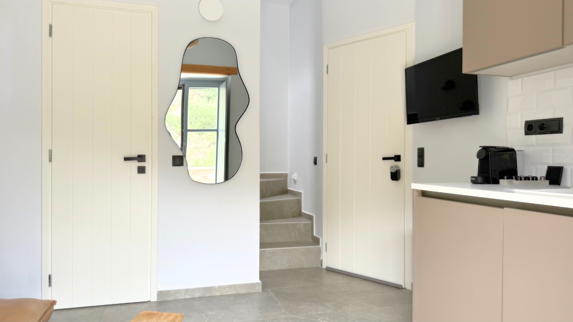 Located in the upper floors of the rear building B and can accommodate up to 2 people. It is a very cozy maisonette with a small living room with a kitchenette & bathroom in the 1st floor as well as a bedroom & bathroom in the tower. You can enjoy a large balcony with amazing views towards sea & mountain.
