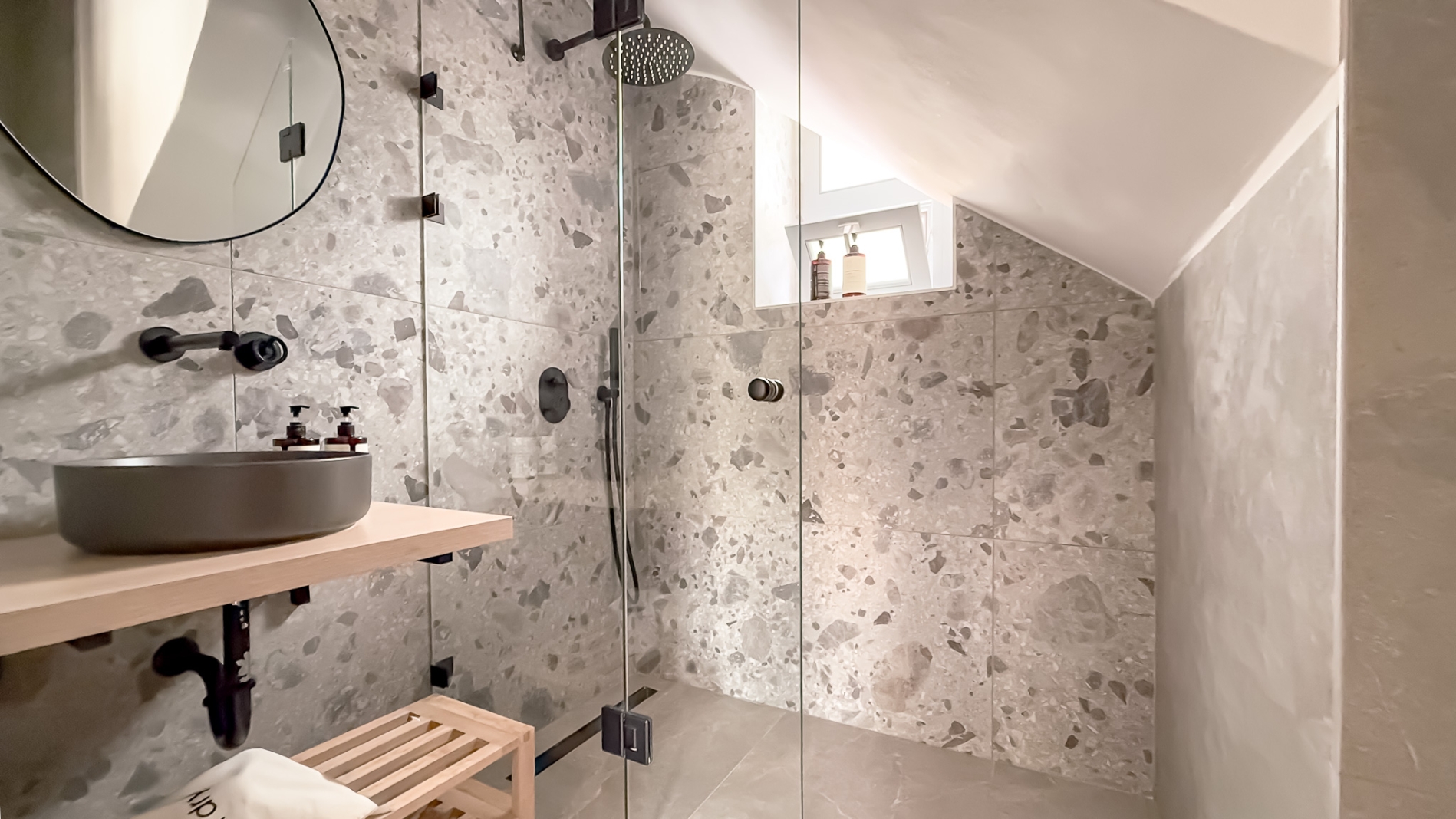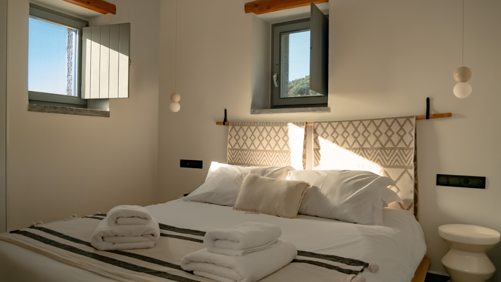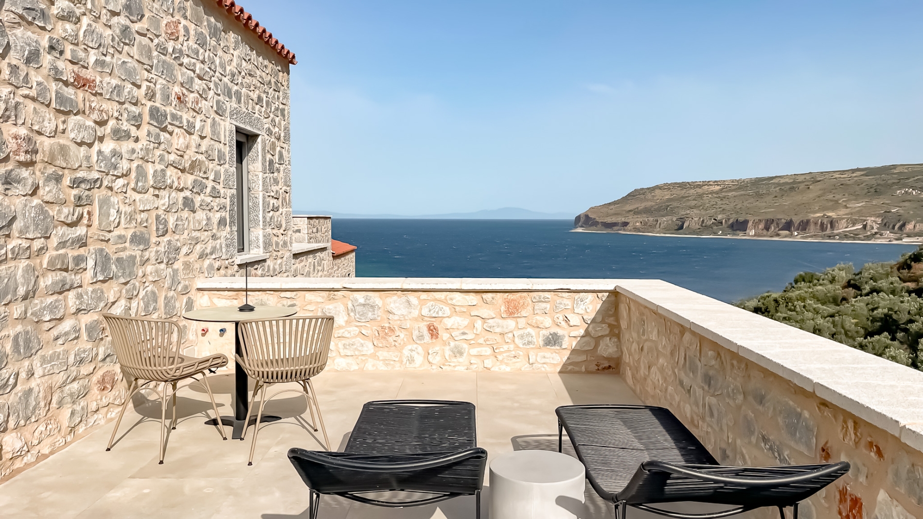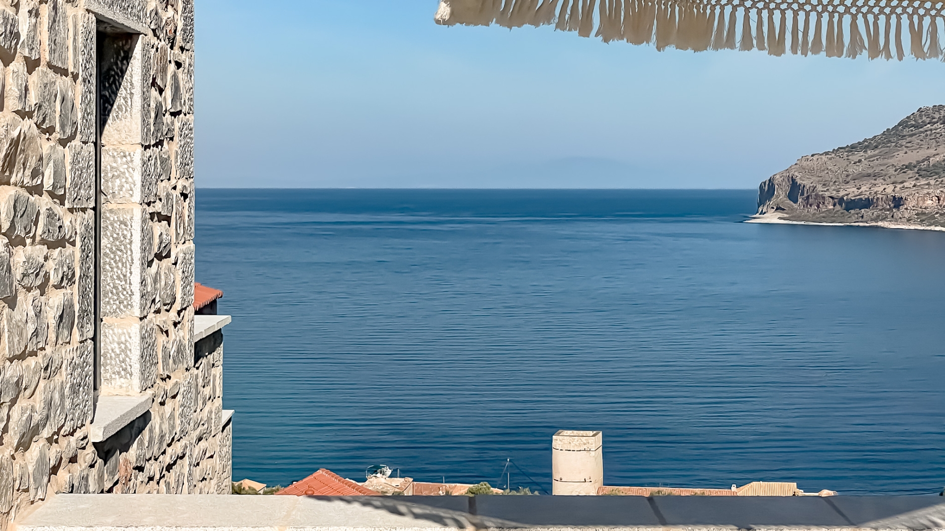 Located in the upper floors of the rear building B and can accommodate up to 2 people. It is a very cozy maisonette with a small living room with a kitchenette & bathroom in the 1st floor as well as a bedroom & bathroom in the tower. You can enjoy a large balcony with amazing views towards sea & mountain.